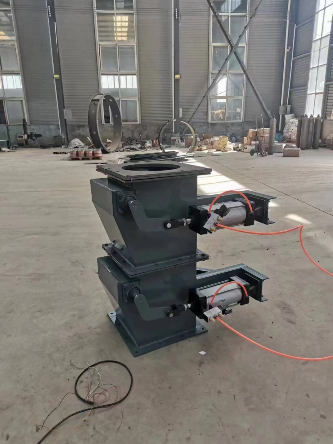電動(dòng)雙層翻板閥/重錘翻板閥制造商河北泊頭潤天環(huán)保機(jī)械設(shè)備有限公司是作為各類除設(shè)備的灰斗卸料裝置及各種磨機(jī)、烘干機(jī)、料倉等設(shè)備的給卸料裝置,防止野風(fēng)吹入,以重錘、電動(dòng)、推桿為主要驅(qū)動(dòng)力。原理:翻板閥的閥板在物料重力作用下自動(dòng)開啟,物料下落后,配重杠桿系統(tǒng)使閥板自動(dòng)復(fù)位,防止野風(fēng)吹入,從而完成物料的輸送。